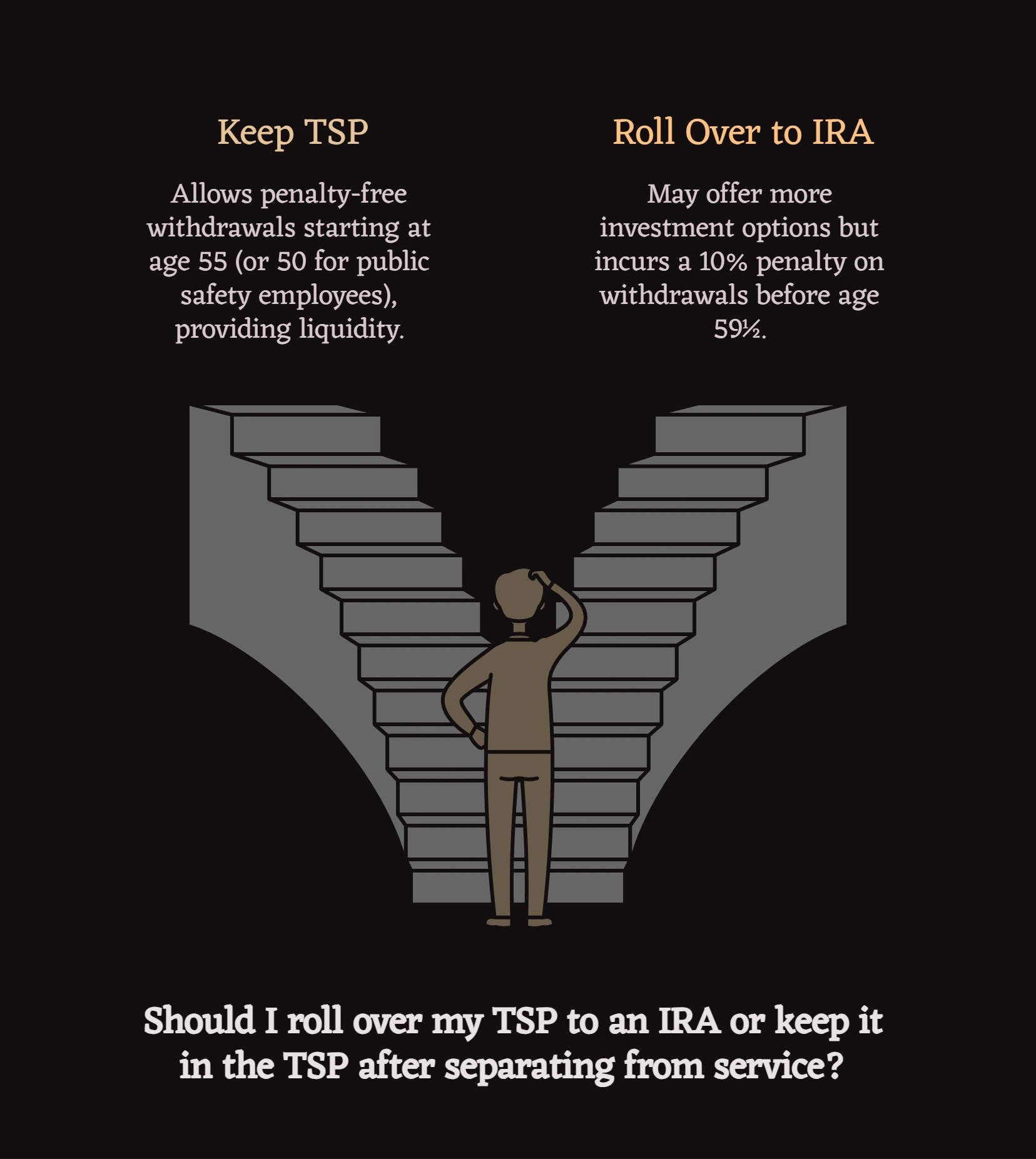 For federal employees retiring between 55-59, this represents a powerful liquidity advantage worth preserving by keeping funds in the TSP rather than rolling to an IRA.